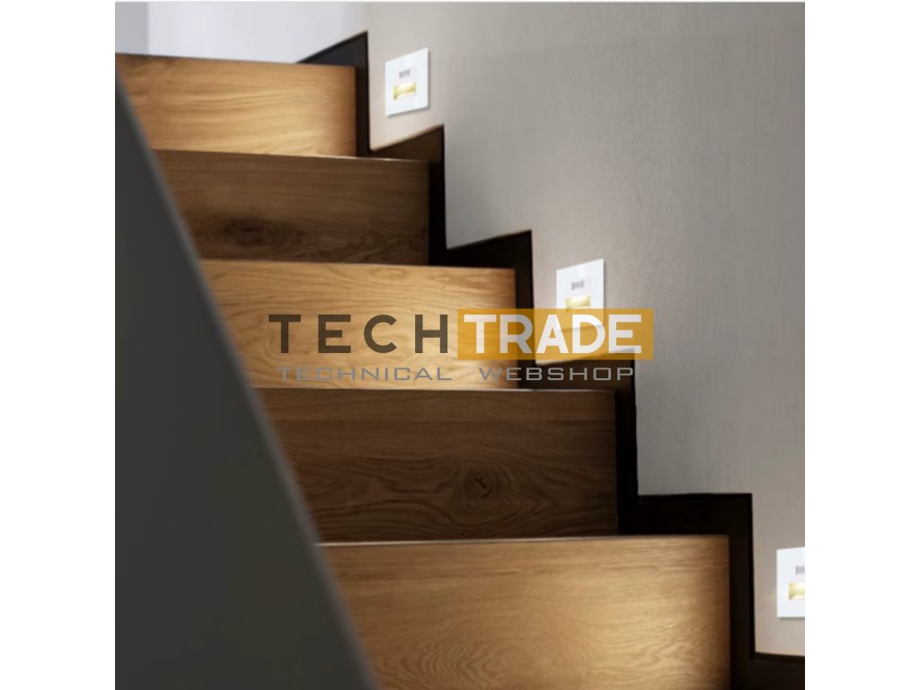 LED Lépcsővilágító Modul – Fehér egy süllyesztett kivitelű, beépített LED-es irányfény, amely mozgás- és fényérzékelővel segíti az automatikus világítást. A készülék 100–240 V AC hálózatról működik, alacsony energiafelhasználás mellett.