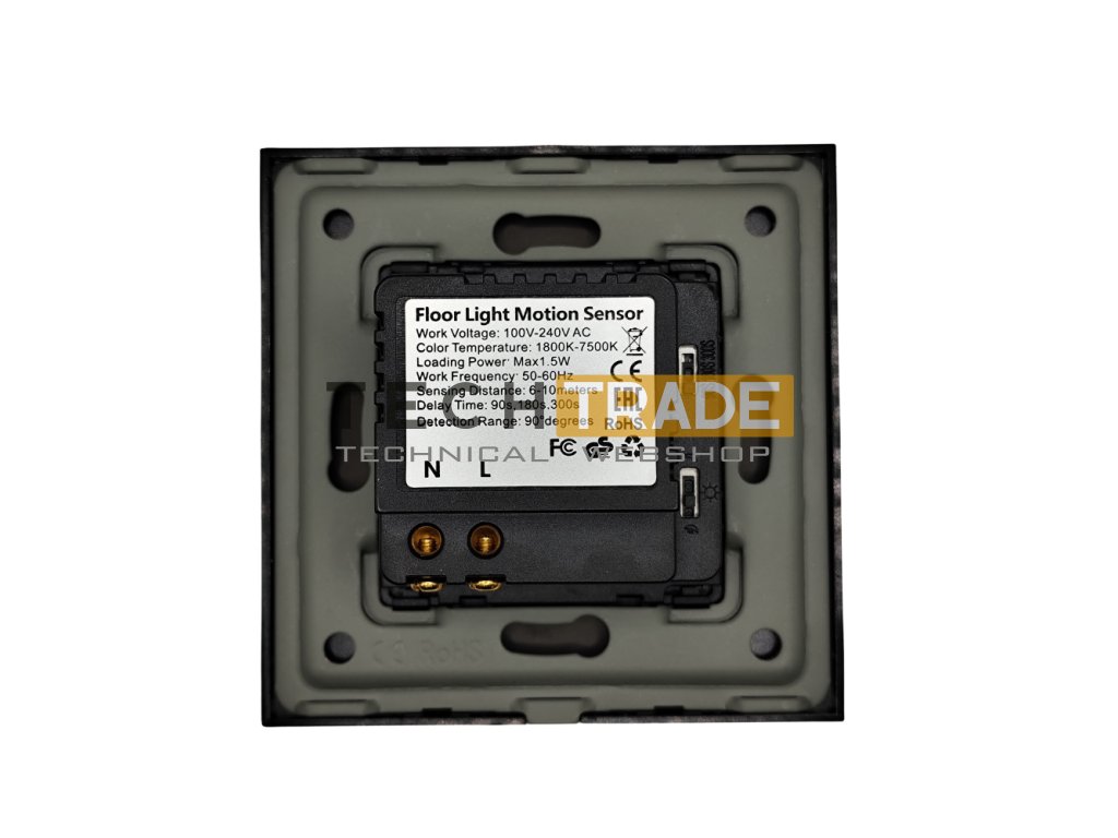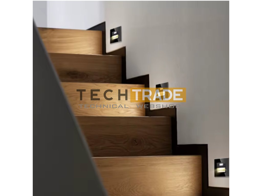 LED Lépcsővilágító Modul – Fekete egy süllyesztett kivitelű, beépített LED-es irányfény, amely mozgás- és fényérzékelővel segíti az automatikus világítást. A készülék 100–240 V AC hálózatról működik, alacsony energiafelhasználás mellett.