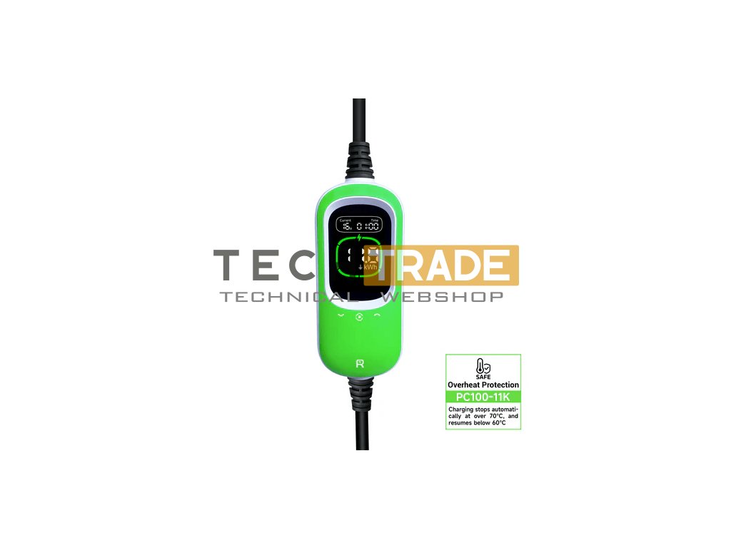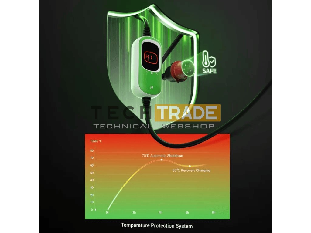 A töltő megbízható és biztonságos működést biztosít bármilyen időjárási körülmények között. Az IP65-ös védettségnek köszönhetően ellenáll az esőnek és pornak, így kültéri használatra is tökéletesen alkalmas. A Schuko csatlakozó hőmérséklet-szabályozó rendszerrel van ellátva, amely megakadályozza a túlmelegedést, biztosítva ezzel a stabil energiaellátást. A hajlításálló, vízálló kábelvédő tovább növeli a termék tartósságát és biztonságát a mindennapi használat során.