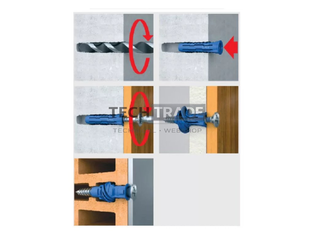 A 6×50 mm-es univerzális tipli egyedülálló belső kialakításának köszönhetően kiváló csavarfogást biztosít. A 4-irányú szétnyílási mechanizmus automatikusan alkalmazkodik az alapanyaghoz: tömör falban feszül, üreges szerkezeteknél kitölti a teret és a felület mögött kapaszkodik meg. A forgásgátló fülek és a fejrészen kialakított bordázás tovább növelik a stabilitást, még puha vagy vegyes szerkezetű falak esetén is.